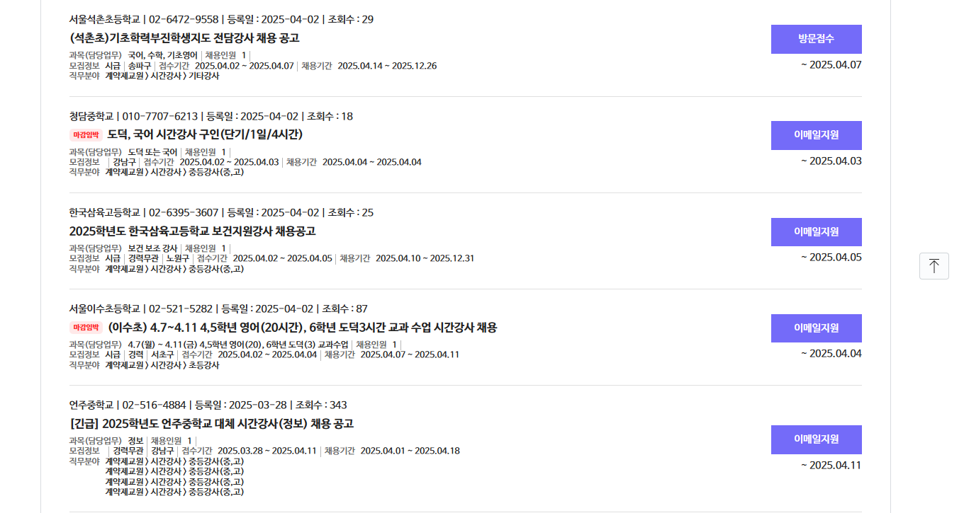교육계 채용 정보를 가장 빠르고 정확하게 확인할 수 있는 이곳은 구직자와 채용기관 모두에게 매우 유용한 플랫폼으로 자리잡고 있습니다.