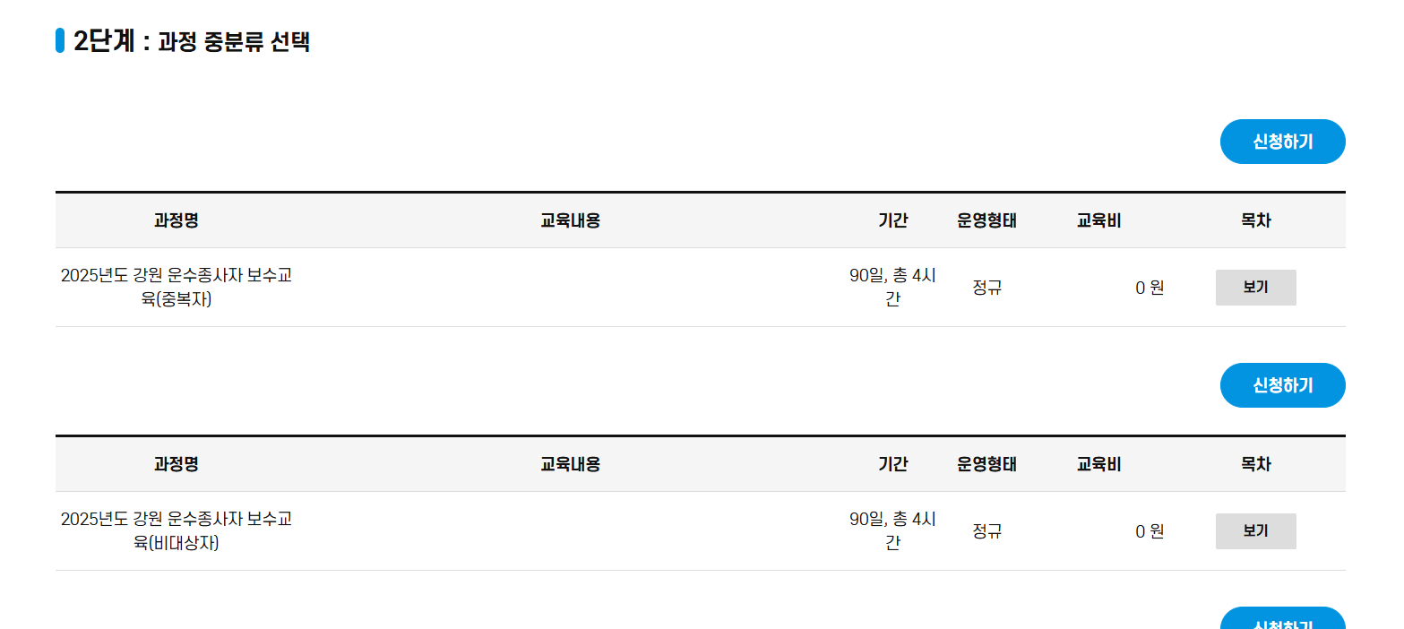 각 과정별로 상세 안내와 수강 가능 기간이 안내되어 있습니다.